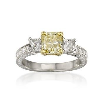 We are delighted to present this absolutely glorious 1.72 carat certified fancy yellow diamond ring with .83 ct. t.w. diamonds! Please note the brilliance of the 1.72 carat center rectangular fancy yellow diamond, and the beauty of the surrounding square and round diamonds. CERT#GIA 13249707. Textured and polished 18kt gold and platinum ring. Diamond birthstones are the perfect gift for April birthdays.